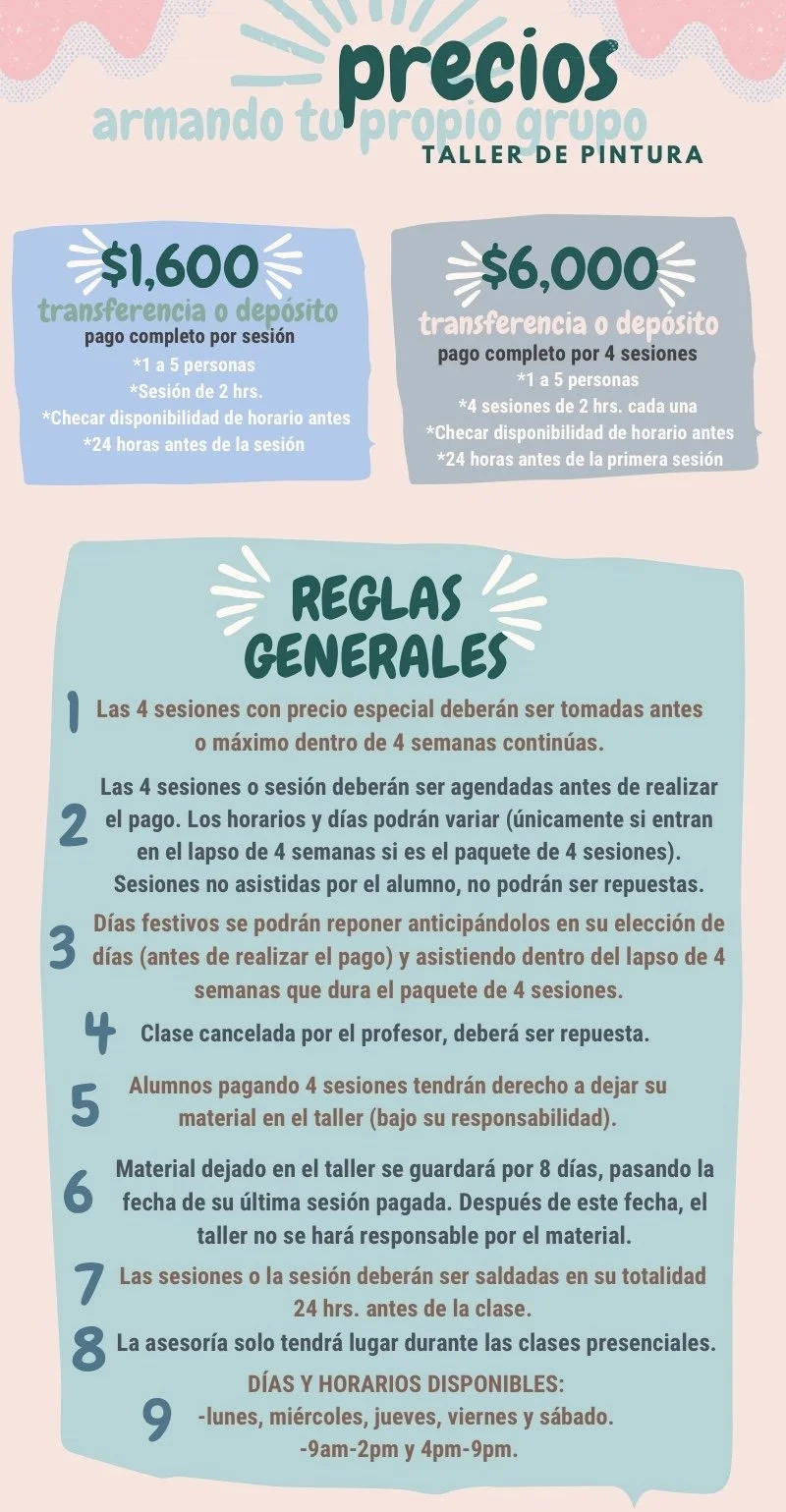 Desde el 2005, recién egresada de la Escuela Nacional de Pintura, Escultura y Grabado, La Esmeralda (INBAL-CDMX), doy clases de pintura enfocadas a que el alumno adquiera conocimientos generales de diferentes técnicas que van desde el óleo, acuarela, resinas, texturas, acrílicos, hoja de oro, plata, etc.