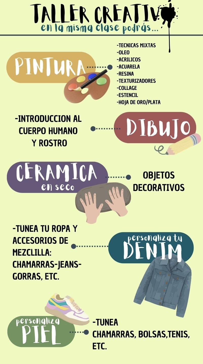 Podrás hacer las diferentes actividades a tus tiempos y cuando tú gustes. Si sólo quieres pintar, está bien! si quieres de repente pintar una chamarra…también! Cada proceso de cada alumno e intereses es individual!